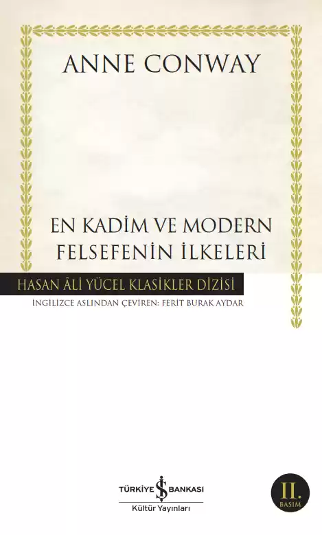 Anne Conway (1631-1679): 17. yüzyıl İngiliz filozofu. Yaşadığı dönemin ilk kadın filozoflarından biridir. Döneminin ünlü filozoflarından Henry More’un başını çektiği Cambridge Platoncuları okulunun üyeleri arasında anılır. Felsefesinde Leibniz ve Kabalist van Helmont’un etkilerini görmek mümkündür. Günümüze kalan tek eseri olan En Kadim ve Modern Felsefenin İlkeleri de ölümünden sonra ilk kez van Helmont tarafından, Amsterdam’da Latince olarak yayımlanmıştır. Anne Conway döneminin popüler felsefelerine bir cevap olarak kaleme aldığı eserinde Kartezyen düalizme karşı çıkar; Spinoza ve özellikle de Hobbes’un felsefelerini kimi zaman alaya varan bir sertlikle eleştirir. Kontes Anne Conway’in bu özgün eseri Türkçede ilk kez yayımlanıyor.